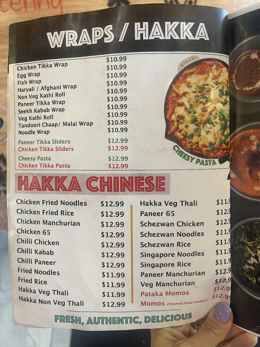 Hakka and Indo-Chinese offerings include various fried rice and noodle dishes, such as Chicken Fried Rice, Schezwan Noodles, and Singapore Noodles, alongside popular appetizers like Chili Chicken and Paneer 65.