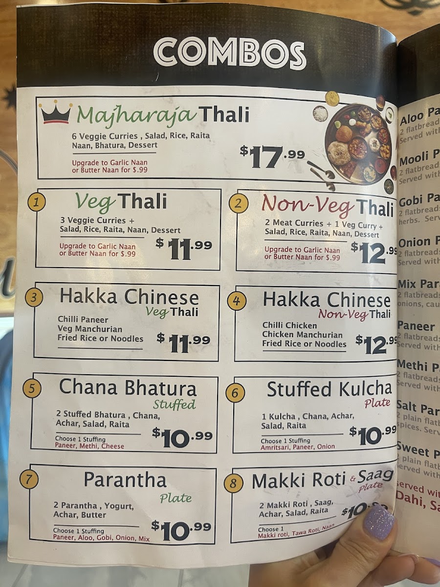 Additional staples such as various types of Thalis (e.g., Veg Thali, Majharaja Thali), Chole Bhature, and bread options like Bullet Naan and Tava Roti are also part of the menu, providing full meal combinations and side accompaniments.