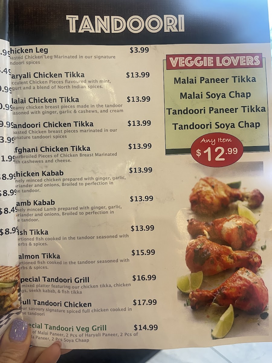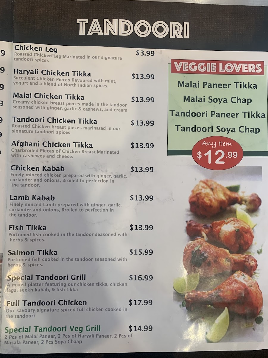 Tandoor selections focus on grilled items cooked in a traditional clay oven, featuring options like Paneer Tikka, Tandoori Fish, Tandoori Kabab, and a mixed grill platter.